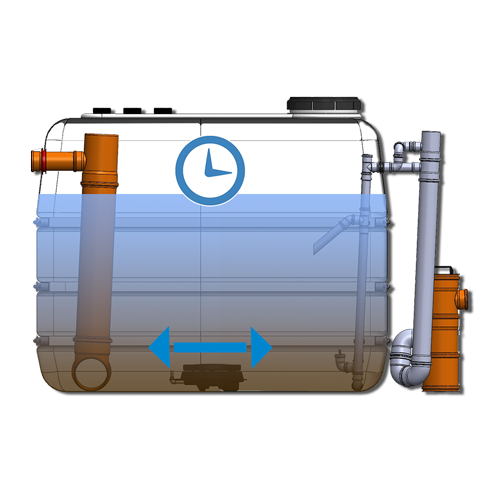 Ein Druckluftheber im hinteren Bereich der Anlage leitet einen Teil des Klarwassers aus dem Behälter ab. Dank seiner speziellen Konstruktion wird das Abpumpen von eventuell auftretendem Schwimmschlamm auf der Klarwasserschicht zuverlässig verhindert. Gleichzeitig minimiert eine Zulaufschräge das Eindringen von Belebtschlamm während der Belüftungsphase. Zudem sorgt der Druckluftheber dafür, dass der gewünschte minimale Wasserstand in der Anlage eingehalten wird – ganz ohne zusätzliche Bauteile.