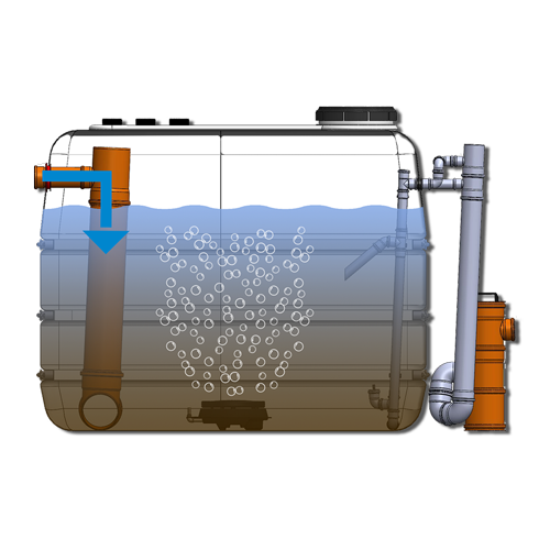 Das rohe Abwasser wird direkt in den vorderen Bereich der Anlage geleitet und einer aeroben Behandlung unterzogen. Membranbelüfter am Behälterboden sorgen für eine gleichmäßige Belüftung, während ein externer Luftverdichter die benötigte Druckluft liefert. Die intermittierende Belüftung versorgt die Mikroorganismen des Belebtschlamms mit Sauerstoff, der für den Abbau der Schmutzstoffe notwendig ist. Gleichzeitig wird der Schlamm mineralisiert, wodurch die Reinigungsleistung optimiert und die Schlammmenge reduziert wird.