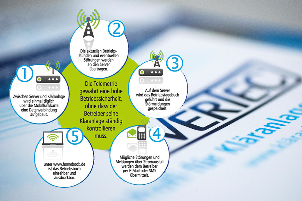 Der Betreiber einer vollbiologischen Kleinkläranlage ist verpflichtet, verschiedene tägliche und monatliche Kontrollen durchzuführen. Diese von den Behörden geforderten Pflichten kann klärofix® durch den Einsatz eines optionalen und aufpreispflichtigen Telemetriebausteins übernehmen. Nach Abschluss eines erweiterten Telemetrie-Fernüberwachungsvertrages mit der Firma WERTEC können diese wichtigen Aufgaben völlig automatisiert werden.